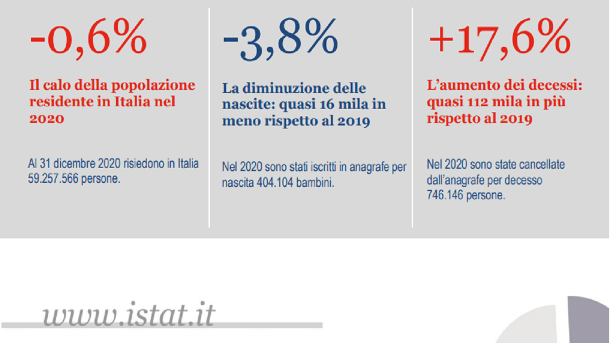 IL DATO | Il rapporto dell’Istat sulla “Dinamica demografica durante la pandemia covid-19-anno2020” mostra le gravi conseguenze che l’epidemia ha avuto sulla consistenza numerica della popolazione italiana. Al 31 dicembre 2020 i residenti in Italia sono diminuiti di 384 mila unità rispetto all’anno precedente, con un calo dello 0,6%, attestandosi a 59.257.566. I matrimoni sono crollati del 47,5%, mentre le nascite hanno visto una flessione del 3,8%, con 404 mila bambini nati nel 2020 contro un totale di 746.146 decessi nello stesso anno. Il fenomeno si è mostrato particolarmente grave nelle Regioni del nord, dove la Lombardia è la più colpita. Dall’Unità d’Italia solo il 1918, a causa dell’epidemia di Spagnola, registra dati analoghi. (fonte: rassegna stampa CDO)